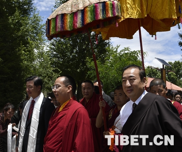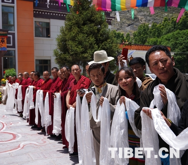 當(dāng)大院內(nèi)響起法號聲時,早已在此等候的僧俗信教群眾紛紛翹首踮足,盼望一睹十一世班禪的風(fēng)采。十一世班禪剛下車,高僧們手持香爐,打著幡幛、華蓋,吹奏佛樂,以藏傳佛教最隆重的禮儀迎接班禪額爾德尼?確吉杰布的到來。身著藏族傳統(tǒng)盛裝的男女青年,向十一世班禪敬獻象征吉祥如意的“切瑪”,表達拉薩各族各界人士和僧俗信教群眾的美好祝愿。在此等候的自治區(qū)有關(guān)領(lǐng)導(dǎo)也與十一世班禪互敬哈達、互致問候。