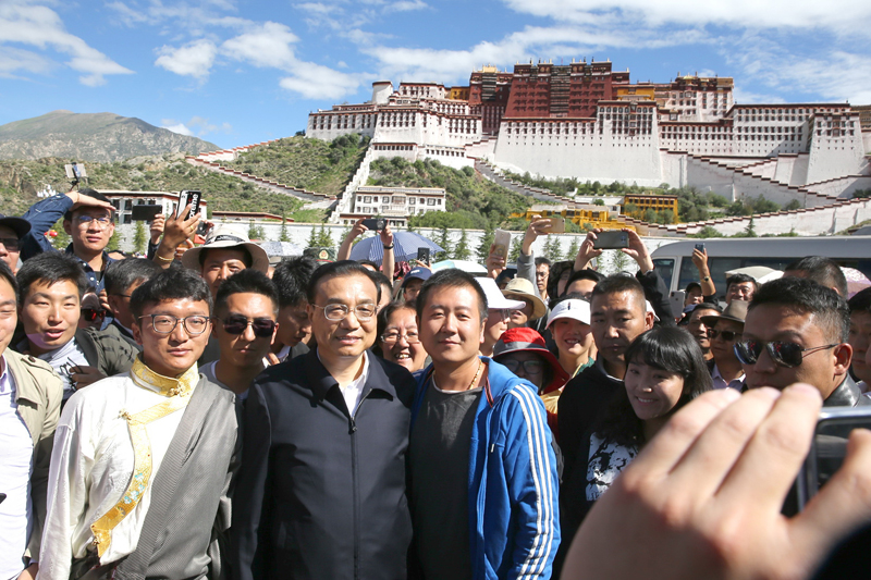 7月27日,考察布達(dá)拉宮文物保護(hù)之后,李克強(qiáng)總理來(lái)到布達(dá)拉宮廣場(chǎng)??吹娇偫淼絹?lái),廣場(chǎng)上的市民與游客潮涌而來(lái),爭(zhēng)相與總理握手。李克強(qiáng)說(shuō),從你們的笑容中和精神面貌上我能感受到這里的氣氛祥和安寧,衷心祝愿大家生活安康,扎西德勒!有游客高聲喊,“總理能不能和我們一起照張相?”李克強(qiáng)欣然應(yīng)允。市民游客們紛紛拿出各自的手機(jī),有的自拍,有的交換手機(jī)相互幫著拍,密集的拍攝聲此起彼伏。