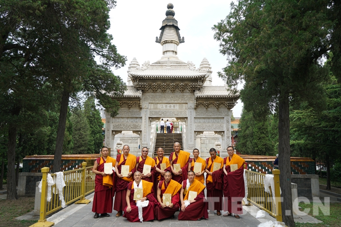 圖為中國藏語系高級佛學(xué)院第十四屆格魯派“拓然巴”學(xué)銜獲得者在西黃寺清凈化城塔前合影留念。后排右三為本文作者日巴。