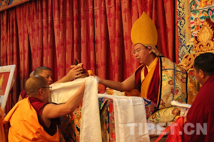 誦經(jīng)結(jié)束后,土多申格副院長帶領(lǐng)3名經(jīng)師代表和3名學(xué)員代表,虔誠地向十一世班禪敬獻(xiàn)曼扎、佛像、佛塔、佛經(jīng),進(jìn)行佛事禮拜。班禪微笑接過供奉,為他們摸頂賜福。