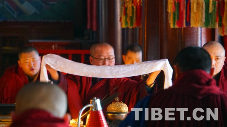 圖為法師舉哈達(dá)誦經(jīng)。