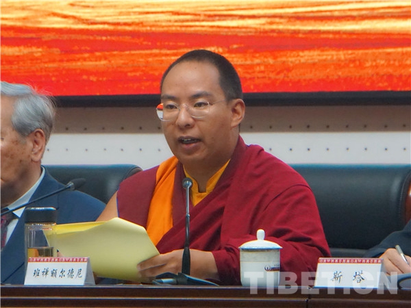 中國藏語系高級佛學(xué)院副院長土多申格、中央民族大學(xué)教授班班多杰、中國藏學(xué)研究中心研究員張云等先后發(fā)言。各位學(xué)者專家分別就十世班禪大師的榜樣精神、從十世班禪大師轉(zhuǎn)世看活佛轉(zhuǎn)世的歷史定制、兩代班禪與青海師范大學(xué)間的特殊因緣、從扎什倫布寺民主管理試點等多角度多層次深入研討大師愛國愛教思想的博大精深,追思他功德業(yè)績的偉大。