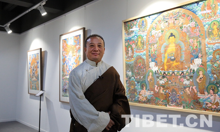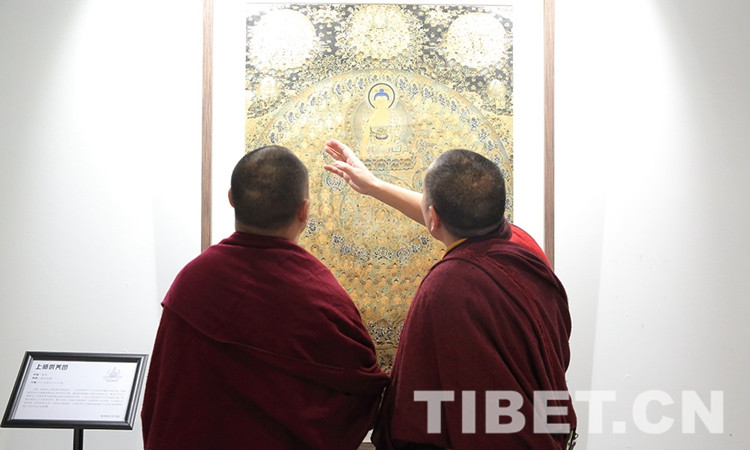 展覽共展出中國(guó)工藝美術(shù)大師、國(guó)家非物質(zhì)文化遺產(chǎn)項(xiàng)目代表性傳承人娘本、以及其弟子參與創(chuàng)作的唐卡作品25幅。圖為娘本唐卡作品《釋迦摩尼佛》。攝影:楊月云