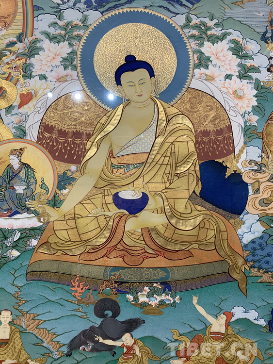 充分利用固有色和夸張色的配合是娘本繪畫唐卡的一大特色。畫佛像時,他善于多用高度夸張的色彩,搭配佛造像優(yōu)美的造型,在現(xiàn)實與幻影般的環(huán)境中展現(xiàn)神佛的魅力,創(chuàng)作出綺麗的藝術(shù)境界;在描繪現(xiàn)實景物時,則注重使用固有色,來表現(xiàn)自然景物原本樸實的色彩。濃重飽和的用金技術(shù)與淡雅柔和的面部設(shè)色相結(jié)合,是娘本繪制唐卡的又一絕活。