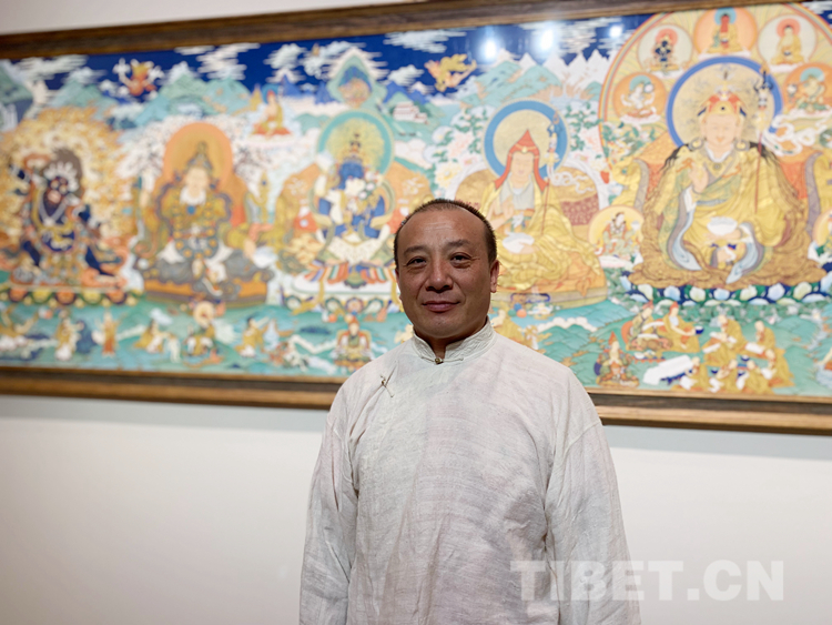 很多人對唐卡并不陌生,但對一幅唐卡是怎么被畫出來的卻是一知半解。唐卡的內(nèi)容大多來源于佛教里的經(jīng)文,里面有詳細的文字描寫,佛的穿著,顏色的搭配,甚至是佛們佩戴的首飾、拿的法器都有明確且詳細的記錄和與描寫。藝術(shù)家還需要有豐富的想象力和創(chuàng)造力,要有很強的構(gòu)圖能力,最重要的是要遵照《度量經(jīng)》等佛教儀軌,正規(guī)的去畫?!皠?chuàng)作一幅唐卡不容易,藝術(shù)家必須要懂佛教的文化、儀軌,懂《度量經(jīng)》,再加上藝術(shù)家自己的藝術(shù)創(chuàng)造能力,才能夠畫好一幅唐卡,這需要藝術(shù)家的綜合能力。”娘本繼續(xù)說:“起稿、涂色、暈染、拉金線、拉線條等每一步驟都是在考核藝術(shù)家自身的能力,藝術(shù)家自己要不斷地學習:學習佛教文化,了解文化的內(nèi)涵,藝術(shù)家需要更多地把心思投入到唐卡,并提高自身的藝術(shù)造詣才能夠畫好一幅唐卡?!?/p>