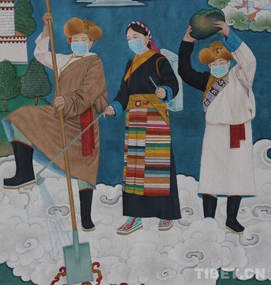 中國西藏網(wǎng)訊 一幅60cm*45cm的畫布上,一位身著藏族服飾的阿佳正戴著口罩噴灑消毒液。這并不是普通的繪畫作品,而是西藏唐卡畫師旦巴云丹耗時(shí)一個(gè)多月繪制的戰(zhàn)“疫”主題唐卡。