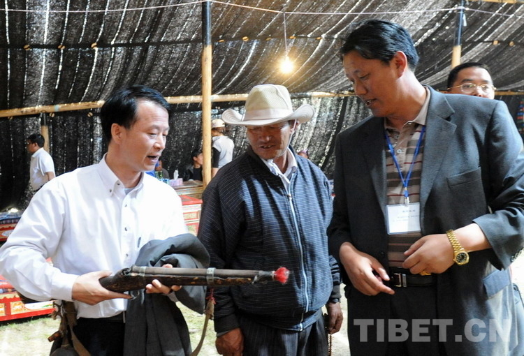 這是時(shí)任那曲縣縣長(zhǎng)扎南(右)與中石化首批援藏干部李一超(左)在那曲賽馬會(huì)的大“黑賬”里,正在交流牧民傳統(tǒng)火槍的使用方法(唐召明2009年8月12日攝)