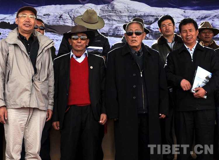 這是唐召明(左一)與雙湖縣縣委書記南培(右一)等領(lǐng)導(dǎo)在贈(zèng)書儀式結(jié)束后合影留念。當(dāng)日,唐召明所著的《走遍藏北無人區(qū)》一書在雙湖縣舉行了首發(fā)和贈(zèng)書儀式(唐召明提供,2013年7月27日攝)