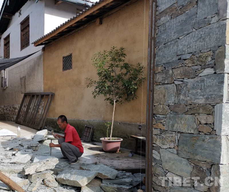 漫步村間,石板鋪就的道路縱橫交錯(cuò),與居民房舍相連。鳥語蟬鳴,人與自然在這里和諧共生。遠(yuǎn)處傳來石頭的敲擊聲,沿石板路而上,循聲走近,看到一位大爺在家門口敲擊著大石塊,記者便好奇地上前詢問。這位大爺告訴我們,他在修建自家的大門。