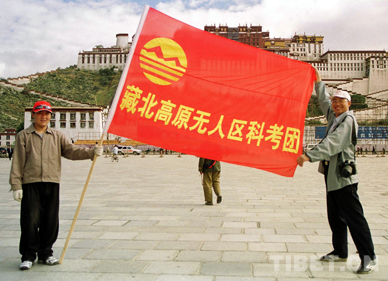 這是唐召明在隨藏北高原無人區(qū)科考團(tuán)出征時(shí),展隊(duì)旗拍照留念(唐召明提供,2001年攝)