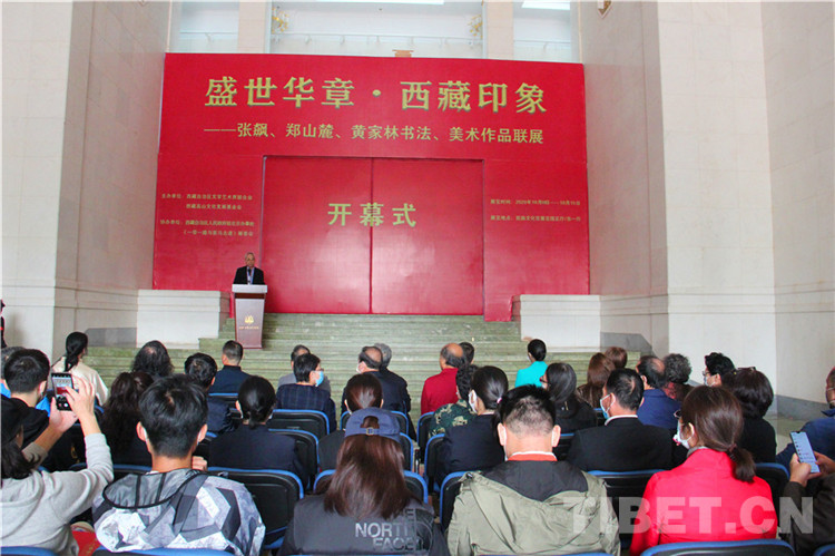 中國西藏網(wǎng)訊 10月10日,“盛世華章?西藏印象——張飆、鄭山麓、黃家林書法、美術(shù)作品聯(lián)展”于北京民族文化宮開幕。來自中國書法家協(xié)會(huì)、中國美術(shù)家協(xié)會(huì)、西藏自治區(qū)文學(xué)藝術(shù)界聯(lián)合會(huì)等單位的嘉賓及藝術(shù)家50余人出席開幕式并參觀展覽。