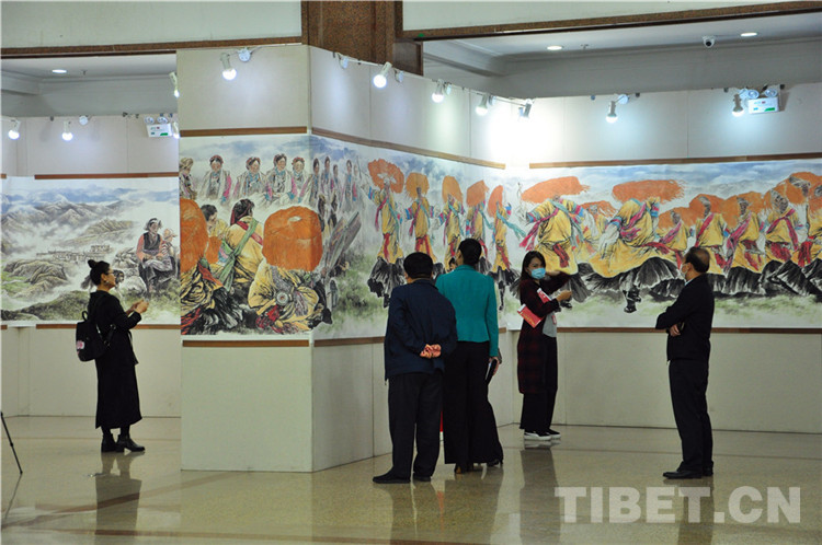 本次展覽由西藏自治區(qū)文學(xué)藝術(shù)界聯(lián)合會(huì)、西藏高山文化發(fā)展基金會(huì)主辦,西藏自治區(qū)人民政府駐北京辦事處和《一帶一路與茶馬古道》籌委會(huì)協(xié)辦,由張飆、鄭山麓、黃家林三位藝術(shù)家聯(lián)袂,以書法、詩詞、繪畫的藝術(shù)形式展現(xiàn)了在黨中央堅(jiān)強(qiáng)領(lǐng)導(dǎo)下,西藏自治區(qū)取得的巨大成就,以及西藏自治區(qū)各族人民加強(qiáng)民族團(tuán)結(jié)、建設(shè)美麗西藏的生動(dòng)實(shí)踐。同時(shí),本次展覽展品中還包括了記錄醫(yī)護(hù)工作者抗擊新冠肺炎疫情的優(yōu)秀作品。在上百件展品中,張飆創(chuàng)作的反映西藏自治區(qū)經(jīng)濟(jì)社會(huì)發(fā)展成就的詩詞、書法,鄭山麓創(chuàng)作的呈現(xiàn)西藏自治區(qū)舞蹈藝術(shù)魅力的60米國畫長(zhǎng)卷《甲諧舞吉祥之盛世歡歌》,以及黃家林以布達(dá)拉宮為主題創(chuàng)作的油畫作品是展覽的亮點(diǎn),吸引觀眾紛紛駐足。