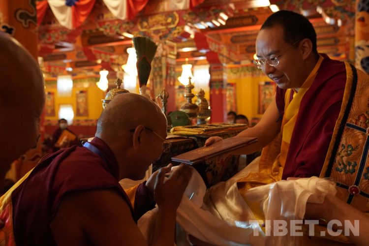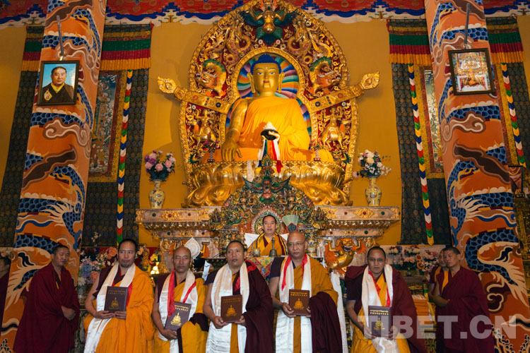 圖為十一世班禪為高僧頒發(fā)然講巴學(xué)位證書(shū) 攝影:鄭朔