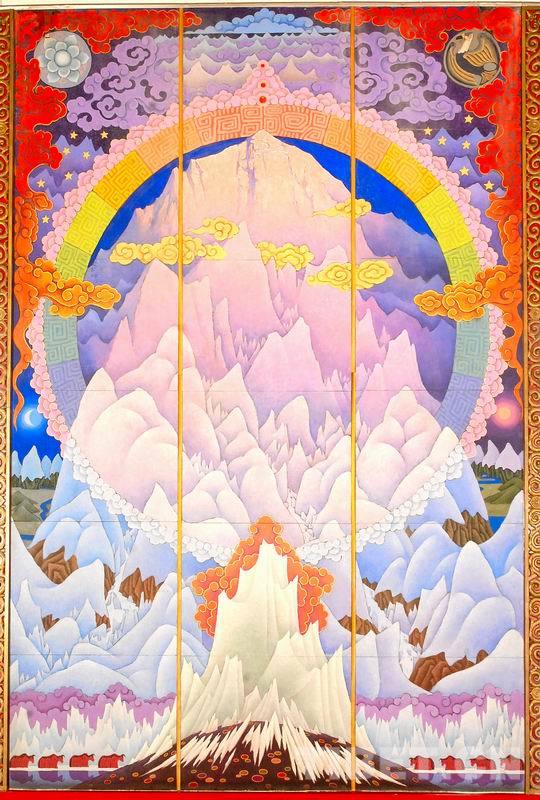而令葉星生深受觸動(dòng)的,是十世班禪大師對(duì)創(chuàng)作的關(guān)心、前衛(wèi)的創(chuàng)作思路和嚴(yán)格的要求?!笆腊喽U大師多次提出指導(dǎo)意見,鼓勵(lì)我們大膽創(chuàng)新,要融入光影等繪畫新技法及漢族傳統(tǒng)繪畫技法,使珠峰更有立體感,使畫作成為現(xiàn)代藝術(shù)技法與藏族傳統(tǒng)繪畫手法相融合的代表,成為民族團(tuán)結(jié)的象征。所以,這幅畫在結(jié)構(gòu)上參考了唐卡,比如彩虹;祥云、太陽(yáng)、月亮、星斗對(duì)稱的方式等來自西藏傳統(tǒng)壁畫藝術(shù);但在光線、明暗對(duì)比等方面加入了漢地工筆重彩,甚至西方的藝術(shù)手法。在天地之間以更加立體的視角展現(xiàn)出了珠峰壯麗雄偉的全景?!?/p>