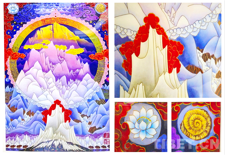 《珠峰疊彩》從1984年開始創(chuàng)作,完成于1985年。畫面最高處是聳立在祥云與環(huán)狀彩虹中的珠峰,中景是層層雪山冰川及河流,近景是林立的冰川、雪原、大地、寶石、湖泊和行進(jìn)中的8頭牦牛,畫面右上角是珠峰雪蓮,左上角是珠峰化石,寓意吉祥幸福。