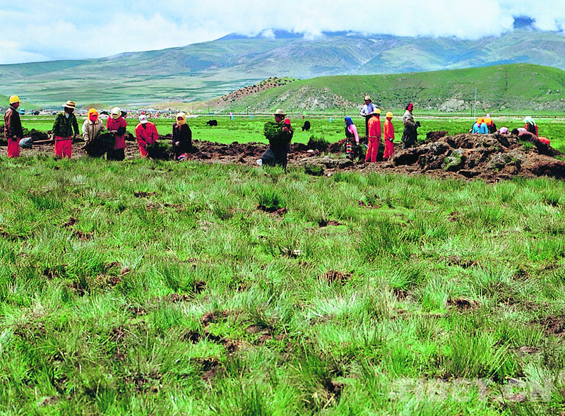 圖為為保護(hù)藏北高原上的生態(tài)植被,中鐵五局職工同藏族群眾一起,將修“天路”處的草皮移走,養(yǎng)植在旁邊。待日后鐵路修通后,再將它移植到鐵路路基的邊坡上(唐召明2003年攝)