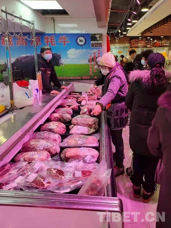中國西藏網(wǎng)訊 近日,北京廣聯(lián)連鎖超市冷鮮肉柜臺前,購買牛肉的市民正在認(rèn)真選購來自西藏昌都市芒康縣的高原牦牛肉。