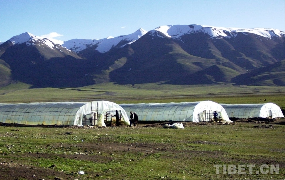 圖為藏北申扎縣城附近新建的太陽能蔬菜大棚,解決了當?shù)厝罕姵圆穗y的問題 唐召明2001年7月4日攝