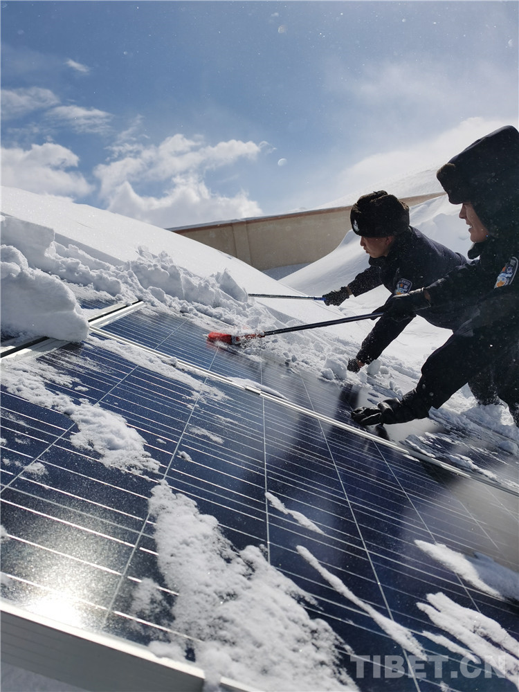 圖為民警們在2019年春節(jié)前遭遇暴雪時清理太陽能電池板上的積雪