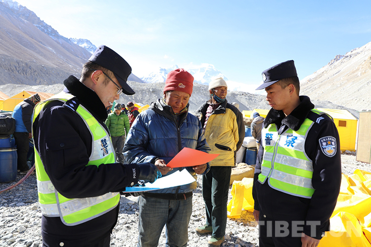 圖為在珠穆朗瑪峰大本營(yíng)執(zhí)勤點(diǎn),民警開(kāi)展普法宣傳 攝影:鄭勁松
