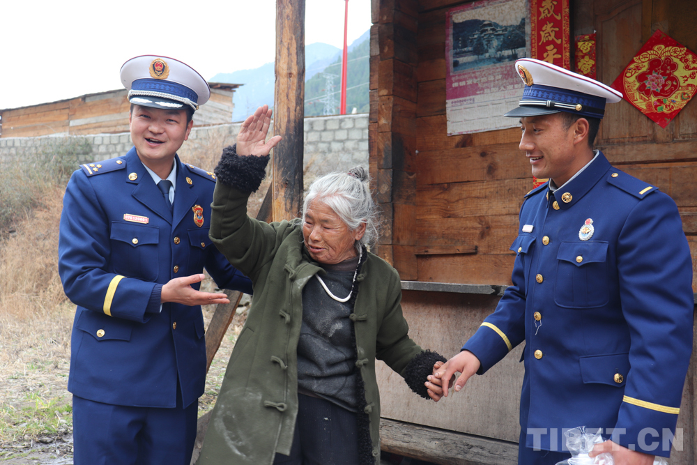 伴隨著冬日里溫暖的陽光,中隊指戰(zhàn)員代表帶著慰問品和節(jié)日的祝福來到了卓給阿媽家中,阿媽高興地迎接大家。指戰(zhàn)員們?yōu)榘審堎N對聯(lián)、整理衣物、收拾衛(wèi)生,給阿媽測量血壓,與阿媽拉家常,小屋沉浸在溫馨祥和的氛圍中。阿媽拉著指戰(zhàn)員的手說道:“謝謝你們經(jīng)常來看我,我雖然沒有兒女,有你們的掛念,心里很滿足。”臨走時,指戰(zhàn)員再三叮囑阿媽有困難一定要及時聯(lián)系,她的“兒子”會經(jīng)常來看望。