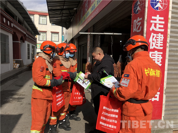 圖為米林縣森林消防中隊指戰(zhàn)員們走街串巷向居民們宣傳防火小常識并發(fā)放宣傳資料