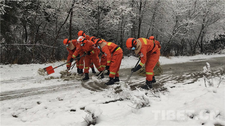 圖為消防員們正在清理道路積雪,為過往車輛保駕護航