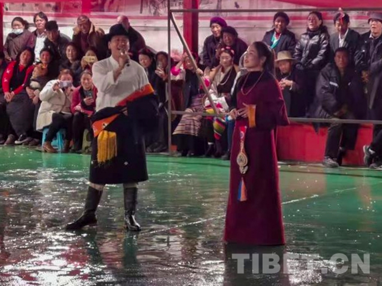 演出活動在服飾表演《幸福的日子》中拉開序幕。安麥西組的農(nóng)牧民群眾身著節(jié)慶盛裝走上舞臺,精彩的服飾走秀展示了當?shù)孛褡逄厣?;歌曲《弦舞芒康》《心中紅》引得群眾情不自禁地和唱,動人的歌詞句句唱進了觀眾的心坎里;群眾自導(dǎo)自演的小品《活捉鬼子》在逗得大家捧腹大笑之余,讓大家明白當前和平生活的來自不易;舞臺劇《四個老頭贊美新時代》及村民帶來的原生態(tài)弦子歌舞《嘎哇啦》演唱出了贊美幸福新生活、感恩共產(chǎn)黨的美好心聲,展示了產(chǎn)生發(fā)展于生產(chǎn)生活中的弦子文化……一場場豐富精彩的表演節(jié)目點燃了圍坐廣場四周的觀眾的熱情。