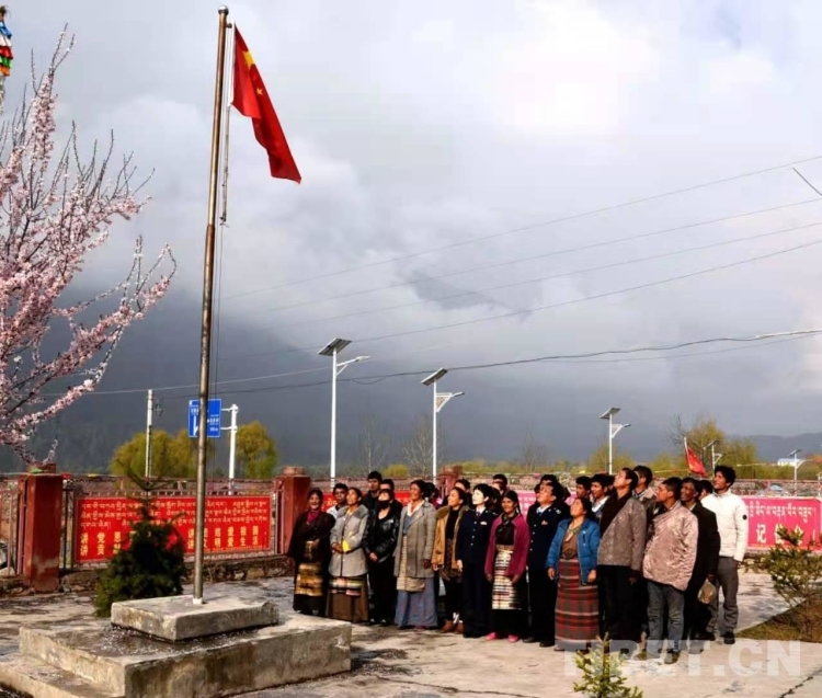 圖為稅收干部和當?shù)厝罕娫谖鞑刈灾螀^(qū)日喀則市吉隆鎮(zhèn)達曼村開展升國旗儀式