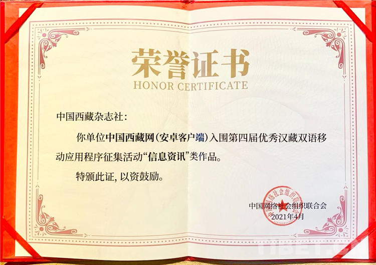 圖為中國西藏網(wǎng)的獲獎榮譽證書