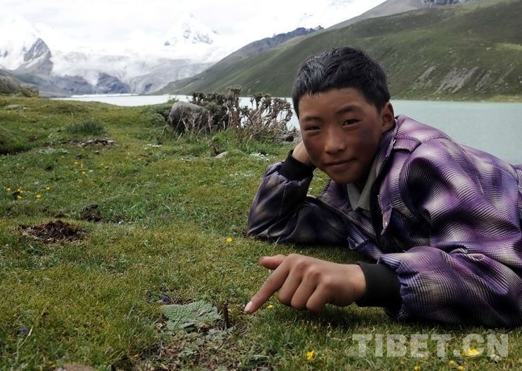 圖為一名牧家大男孩手指藏北比如縣薩普冰川下的草地上生長的一根蟲草(唐召明2014年7月10日攝)