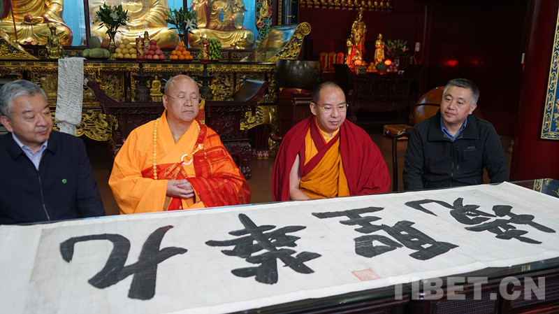在化城寺,班禪觀賞了文物“清康熙皇帝御書(shū)'九華圣境'四字真跡”。班禪表示:“無(wú)論任何民族,都應(yīng)繼承和發(fā)揚(yáng)傳統(tǒng)中華文化,‘班禪額爾德尼’的稱(chēng)號(hào)亦是康熙皇帝所賜。身為滿(mǎn)族人的康熙皇帝擁有著豐功偉業(yè)的一生,收復(fù)臺(tái)灣,穩(wěn)定邊陲,為祖國(guó)統(tǒng)一做出了杰出貢獻(xiàn)。所以,鑄牢中華民族共同體意識(shí),需要各個(gè)民族,各個(gè)宗教信仰始終貫徹。這件文物就是很好的歷史見(jiàn)證。”