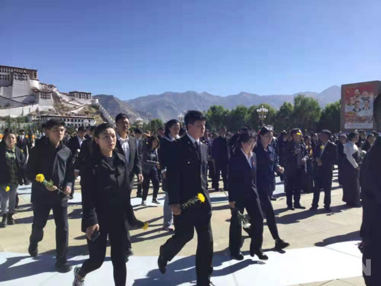 中共西藏自治區(qū)委員會、西藏自治區(qū)人大常委會、西藏自治區(qū)人民政府及各界群眾等分別敬獻(xiàn)的9個大型花籃一字排開,花籃紅色緞帶上書寫“革命先烈永垂不朽”8個金色大字。