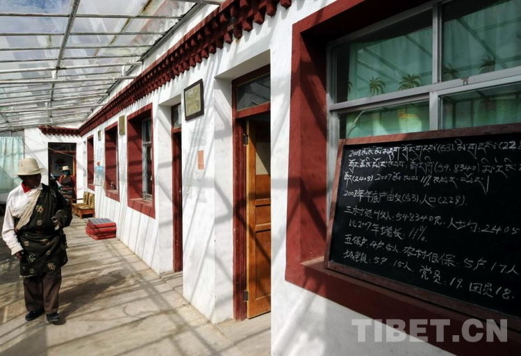 走進村委會的玻璃式采暖房,首先映入眼簾的是申扎縣委頒發(fā)的“安全文明村”金色牌匾,以及藏漢文兩種文字的學習墻報。