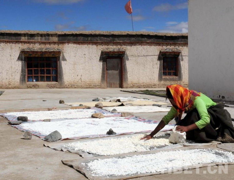 我發(fā)現(xiàn),這里的專業(yè)合作經濟組織在遼闊的草原上發(fā)揮了很大作用。分離酥油生產間里,4位年輕的婦女在臉盆粗的牛奶木桶上,雙手握著木桿式活塞一上一下地打牛奶,分離酥油;一位年老的婦女在房前水泥空地上攤曬奶渣;4位牧民在村莊后為幾十頭牦牛挨個擠牛奶,還有幾位婦女手拎橡膠桶,在草地上撿拾濕漉漉的牛糞,然后倒在草地上,再用手攤成一個個牛糞餅曬干,最后摞成牛糞垛,作為冬季取暖的燃料……大家分工明確,各司其職。