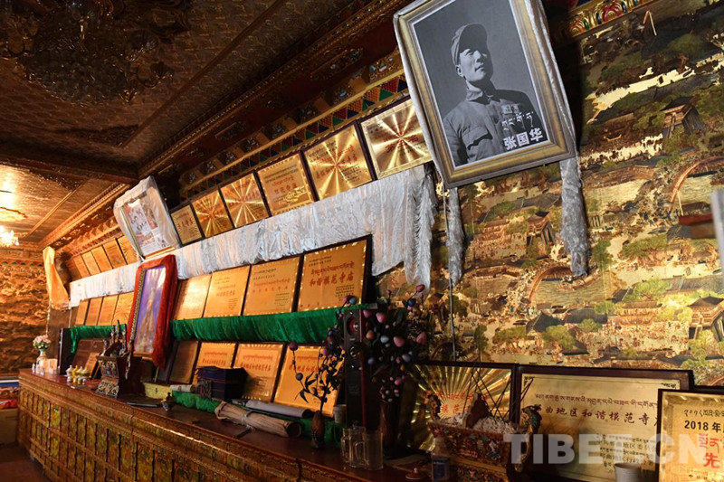圖為寺廟懸掛著西藏自治區(qū)級(jí)、市級(jí)、縣級(jí)和諧模范寺廟、愛國(guó)愛教寺廟等榮譽(yù)獎(jiǎng)牌,以及前西藏軍區(qū)司令員、十八軍軍長(zhǎng)張國(guó)華的照片 攝影:索南多杰