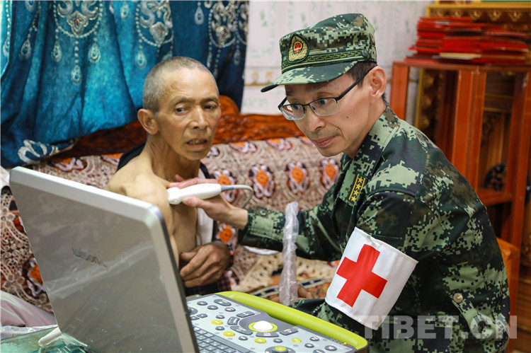 圖為軍醫(yī)吳赤球利用醫(yī)療器材為村民檢查身體