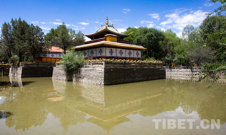 這座隱匿于茂密園林中的宮殿,上下兩層設計精巧別致,漢白玉石欄,核桃木地板,南北通透的玻璃窗和滿墻滿壁的點染,勾畫著的高原勝跡。壁畫環(huán)繞四壁,極為養(yǎng)心養(yǎng)眼。