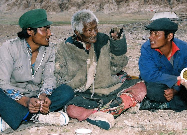 老人說(shuō)我是遠(yuǎn)方來(lái)的客人,盡管是第一次見(jiàn)面,也非要拉我們?nèi)ニ业膸づ褡隹筒豢伞=舆^(guò)我遞過(guò)去的香煙,老人連連說(shuō):“吐基其,吐基其(謝謝)!”趁他和畜牧局干部交談,我悄悄地拿起身邊的照相機(jī),但我的舉動(dòng)還是被老人發(fā)現(xiàn)了。他將那袒露在外面的臂膀套進(jìn)皮袍里,笑容滿(mǎn)面地直視我的鏡頭,讓干部邊巴告訴我:“我要拍張笑的照片,要讓人們知道羌塘有位生活非常幸福的老壽星。”說(shuō)完,他像頑童一樣哈哈大笑……