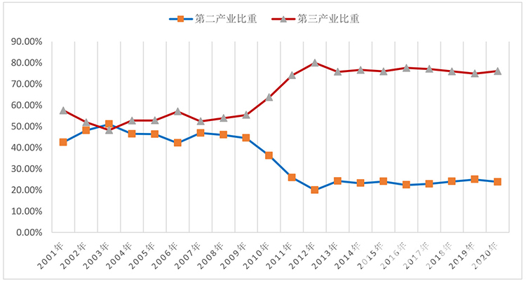 圖為2001—2020年西藏稅收收入分產(chǎn)業(yè)比重(%)