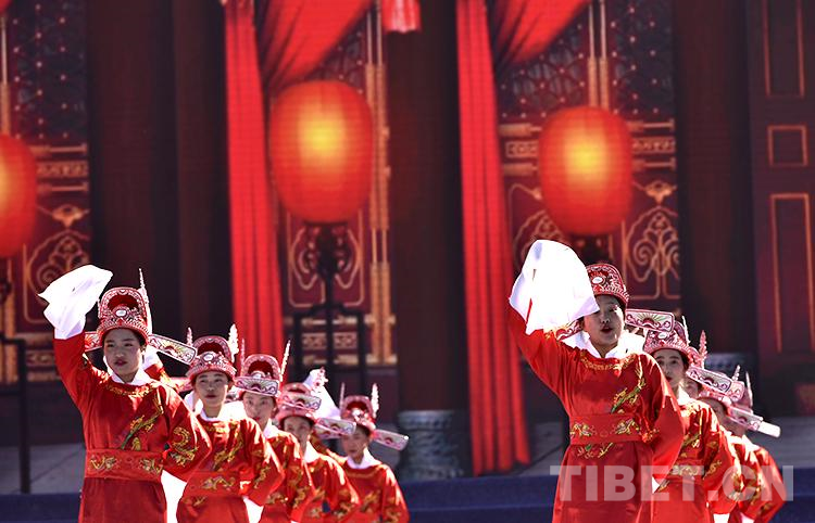 舞臺上,西藏背鼓和安徽鳳陽花鼓同臺敲擊,山南市第二高級中學(xué)的學(xué)生們穿著戲服用藏漢雙語演繹著黃梅戲《女駙馬》選段,熱烈的掌聲從觀眾席傳出。