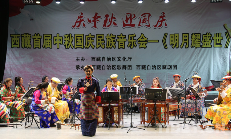 中國(guó)西藏網(wǎng)訊 器樂(lè)齊奏、堆諧奔放、歌曲悠揚(yáng)……9月25日晚,一臺(tái)以“享民樂(lè)美、敘佳節(jié)情”為主題的民族音樂(lè)會(huì)——《明月耀盛世》在西藏自治區(qū)藏劇團(tuán)上演。作為西藏自治區(qū)首屆中秋國(guó)慶民族音樂(lè)會(huì),音樂(lè)會(huì)營(yíng)造了濃厚喜慶的節(jié)日氛圍。
