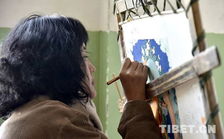 圖為西藏唐卡畫院學(xué)徒正在繪制唐卡
