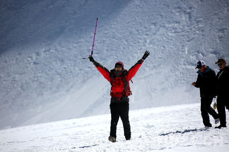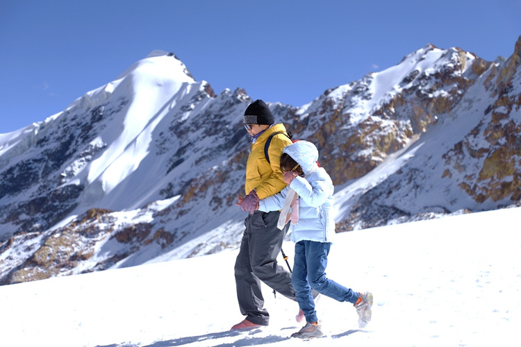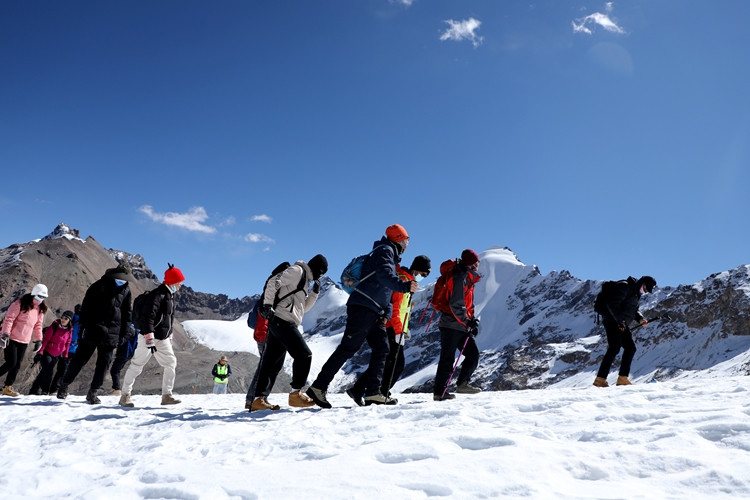 楊女士進藏已有半月,在專業(yè)人士的協(xié)助下她第一次近距離接觸了冰雪世界,并攀登到了海拔5600米的地方?!敖裉煳覜]有高原反應,帶的氧氣也沒用?!痹谘┥缴蠗钆康呐d奮之情溢于言表。