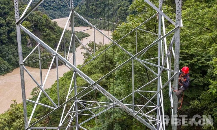 圖為工人正在鐵塔上進行施工作業(yè),腳下是湍急的帕隆藏布江 攝影:趙耀