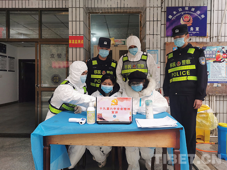 圖為樟木邊境派出所第三警務(wù)室執(zhí)勤民警與口岸醫(yī)院醫(yī)護(hù)人員共同學(xué)習(xí)十九屆六中全會(huì)精神