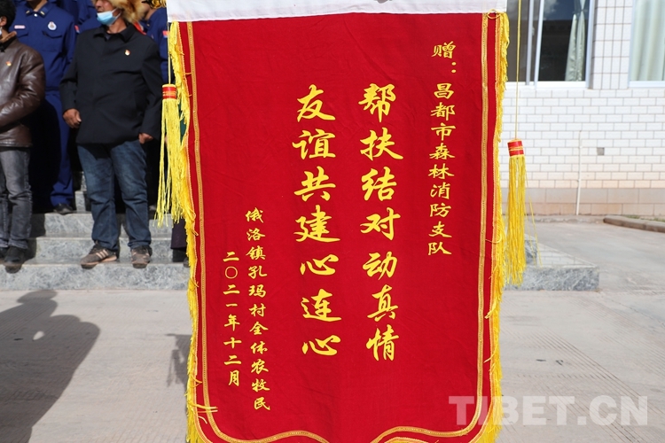圖為孔瑪村向昌都市森林消防支隊(duì)獻(xiàn)上錦旗