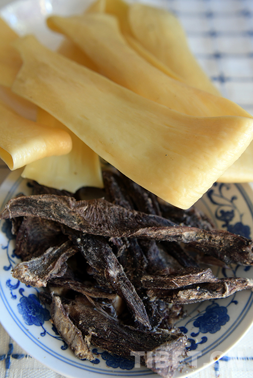 在藏北,常見(jiàn)的傳統(tǒng)風(fēng)干牦牛肉是不加任何佐料的,為的是讓肉保持最純粹的原味。每年進(jìn)入11月底,藏北已是天寒地凍,牧民們先將新鮮牦牛肉切成條型狀,然后掛在通風(fēng)處晾起來(lái),使之冰凍風(fēng)干,自然脫去水分。第二年3月后取下生吃即可,味道十分鮮美。
