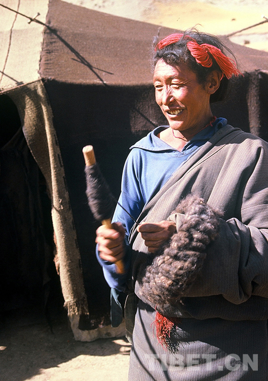 這是一名牧民男子在家中帳篷前捻用來(lái)織帳篷的牦牛線。過(guò)去牧民逐水草而居,住的是可以隨時(shí)拆遷的牛毛帳篷。如今,大多數(shù)牧民已住進(jìn)寬敞明亮的安居房,已很少自己捻毛線來(lái)織帳篷了(唐召明1987年攝)