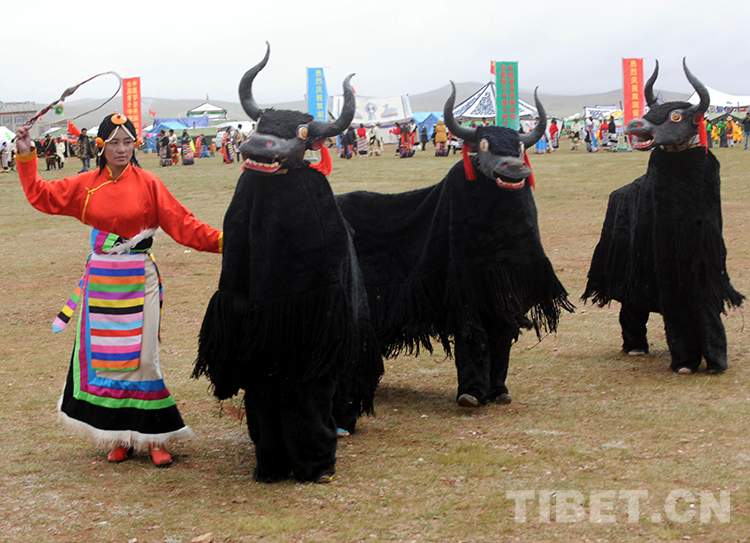 這是在那曲地區(qū)雙湖特別區(qū)(現(xiàn)那曲市雙湖縣)“撤區(qū)建縣”慶?;顒?dòng)上表演的“牦牛”舞(唐召明2013年7月26日攝)